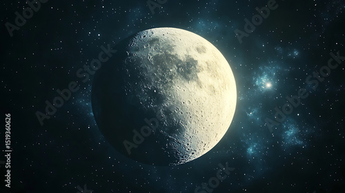 Close up of the moon in deep space with stars showing impact craters and full moon phases against dark blue celestial background representing space exploration