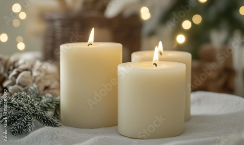 Close up of three candles with a blurry background. The candles are lit and the scene has a warm and cozy feeling