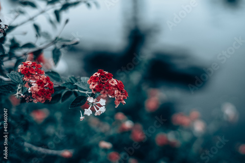 Close up of tiny of bunch flowers reflecting on the lake still water. Selective focus. Copy space.