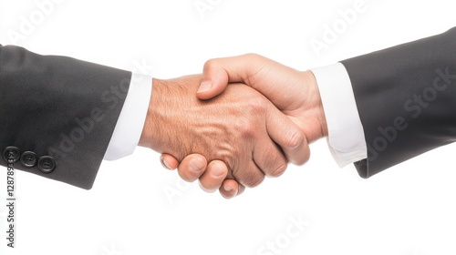 Close Up Of Two People In Suits Shaking Hands Against A White Background