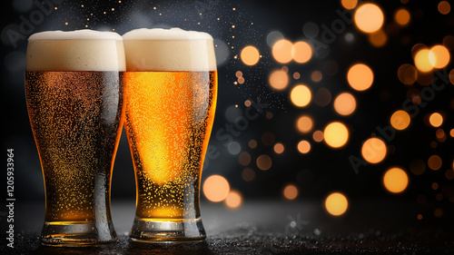 Close up of two pints of beer with bubbles on dark background, creating festive atmosphere with sparkling lights. Perfect for celebrations and gatherings
