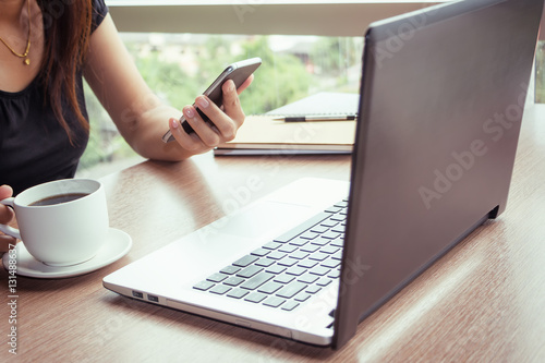 Close Up of woman hands using mobile phone and laptop computer with blank copy space screen for your advertising text message or content business in the Vintage effect.