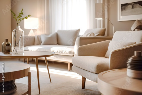 Close up of wooden round coffee table near beige fabric mid-century armchair. Scandinavian style home interior design of modern living room. Created with generative AI