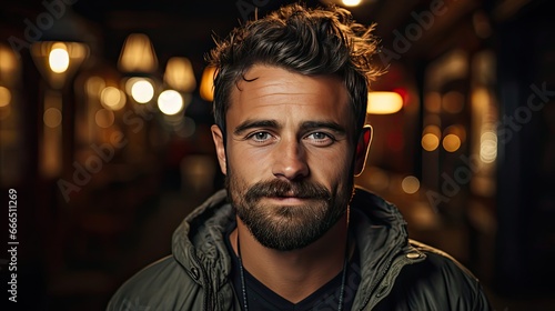 Close up of young handsome man with beard, smiling at camera with confidence, standing over background. Man face portrait illustration. Generative AI