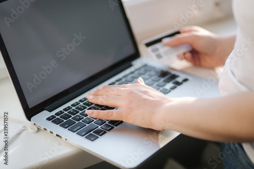 Close up of young woman shopping online using laptop phone and credit card. Laptop on windowsill