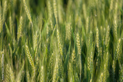 close up on green wheat ears on late spring