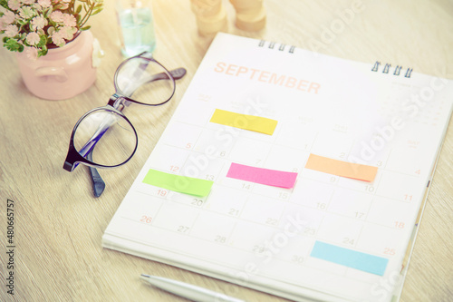 Close up paper note on business desk calendar with office equipment concept of event planner or personal organization reminder and schedule or planning.