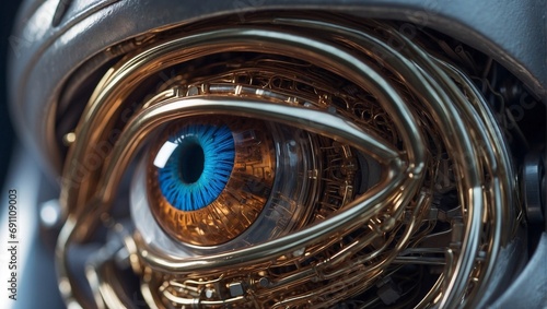 Close up photo of a biomechanical eye. futuristic robotics concept. Generative AI.