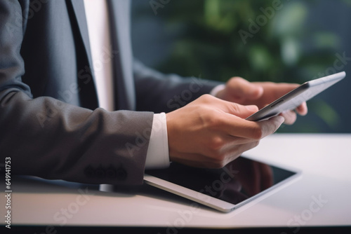 Close up photo of businessman hands typing something on his tablet while standing in a living room