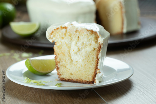 Close up piece of Moist lemon fruit cake on plate with lemon slices on wooden table. Delicious breakfast, traditional tea time. Lemon cake recipe.