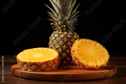 Close up pineapple isolated on black background, Pineapple slices on wood table, Generated AI