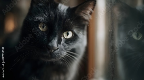 Close up portrait of a black cat with intense eyes looking through a window with its reflection visible
