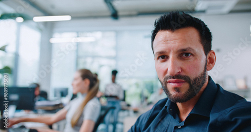 close up portrait of a man in blue shirt and looking with focus at screen. People working on technology devices in background.