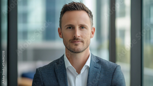 Close up portrait of a man with a blazer and white shirt in front of a window with city view