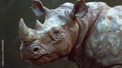 Close up portrait of a rhinoceros with a serious expression, showing its wrinkles and texture.