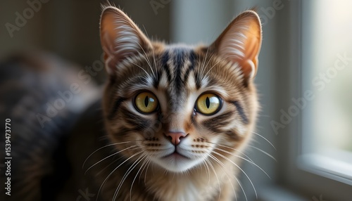 Close up portrait of a tabby cat with striking yellow eyes looking directly at the camera indoors near window