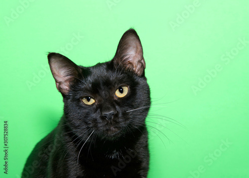 Close up portrait of an adorable black cat looking directly at viewer with skeptical expression. Green background with copy space.