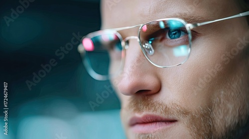 Close Up Portrait of Man Wearing Glasses with Reflective Glare, Light Blue Eyes and Neutral Expression with Blurry Dark Background