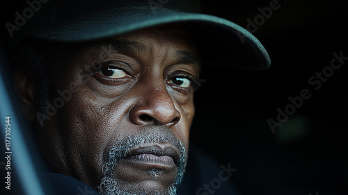 close up portrait of man with serious expression, wearing cap. His deep set eyes convey sense of contemplation and strength, set against dark background