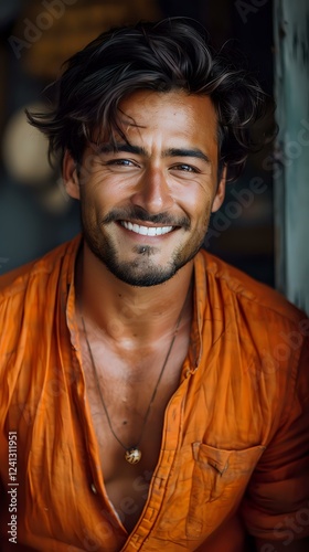 Close up portrait of young Hispanic man with bright smile wearing orange shirt, looking directly at camera with confident expression and natural lighting.