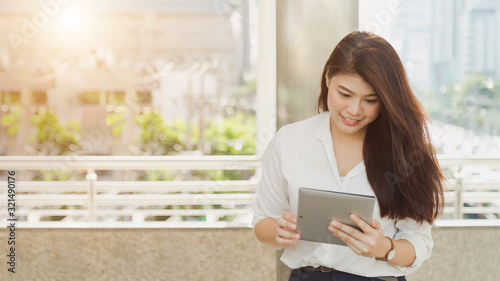 Close up portrait young Asian woman standing using tablet with smile at modern footbridge with office building and street background.