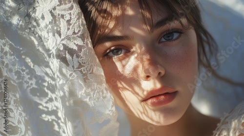 Close Up Portrait Young Woman Freckles Lace Sunlight