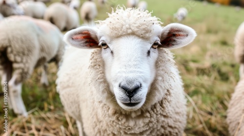 Close up sheep in field. Sheep standing in a field with green grass and dry foliage. The sheep is looking directly at the camera with an inquisitive expression.