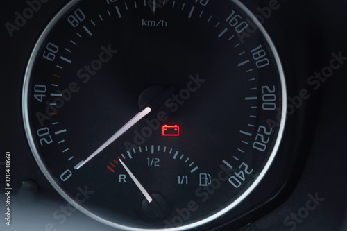 Close up shot of a car dashboard with the battery icon lit.
