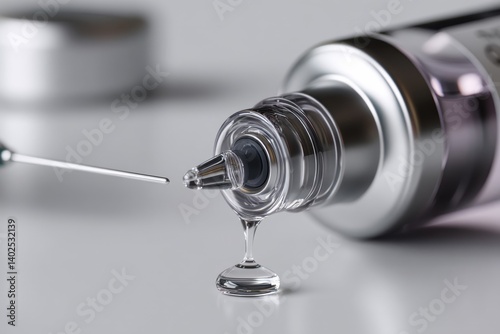 Close up shot of a clear liquid dropping from the tip of a syringe needle with a silver tube. Preparation of medication concept.