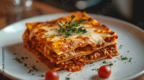 Close up shot of a lasagna dish topped with parsley on a white plate with cherry tomatoes