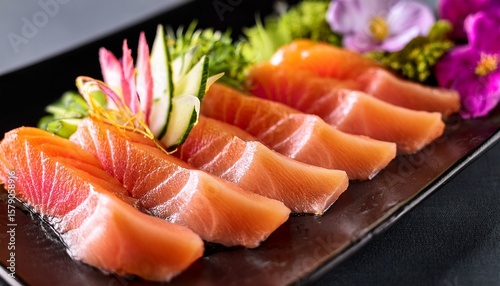close up shot of delicate slices of sashimi artfully presented on a black plate with thinly sliced radish and edible flowers adding a touch of elegance