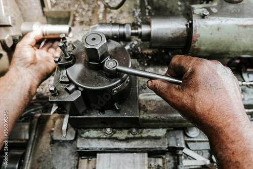 Close up shot of manual worker hands. Factory for industrial production of hydraulic hoses.