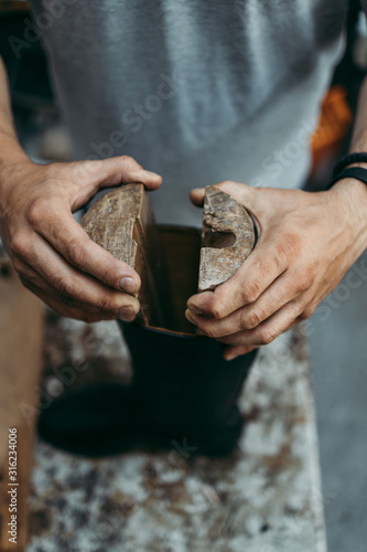 Close up shot of old shoemaker in his store. Traditional way of shoe making process.