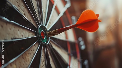 Close up shot of the dart arrow hit on bulleyes of dartboard to represent