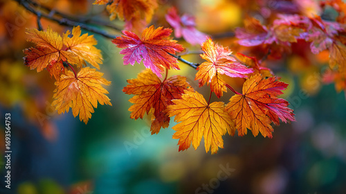 Close up shot of vibrant maple leaves displaying autumn colors on a tree branch outdoor