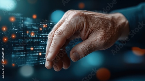 Close up view of a human hand reaching out and touching a digital data network and information technology concepts This image illustrates the ideas of future digital transformation innovation