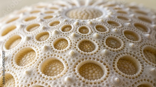 Close up view of a white sea urchin skeleton showing its intricate natural patterns and beautiful organic texture. This marine structure reveals the beauty of ocean life.