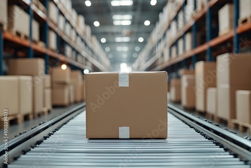 Close up view of an interior abandoned distribution warehouse with a stack of cardboard boxes and a defocused empty conveyor belt line showcasing the logistics and storage elements of an e commerce