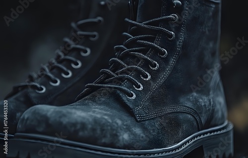 Close up view of black suede combat boots with gray laces against dark background, showing detailed texture and craftsmanship of rugged footwear design.