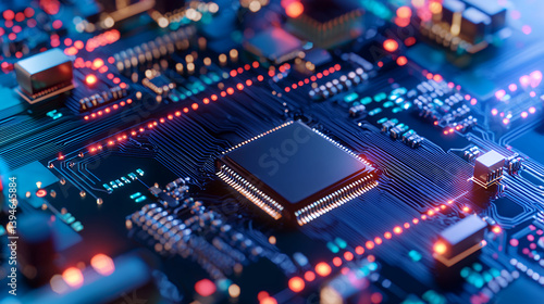 close up view of circuit board featuring microchip, intricate wiring, and glowing LED lights, showcasing technology