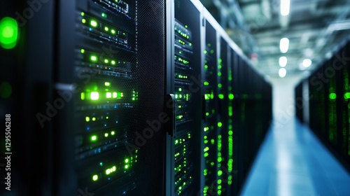 Close Up View of Data Center Server Racks with Green LED Lights in a Modern Facility : Generative AI