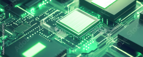 close up view of digital circuit board featuring intricate patterns and glowing green elements, showcasing complexity of modern technology and digital payment systems