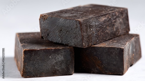 Close up view of handcrafted natural soap bars with rich dark color and textured surface