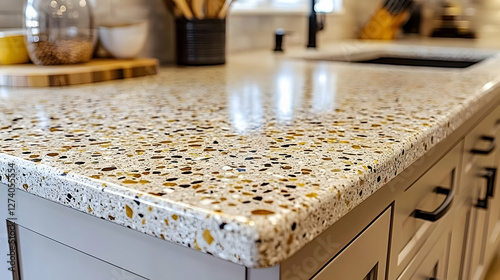 Close Up View Of Modern Kitchen Countertop With Composite Stone