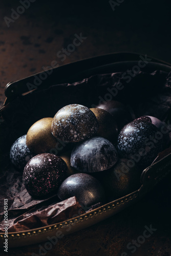 close up view of pile of different chocolate candies in metal basket on wooden table
