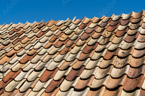 close up view of red and orange burned clay roof tiles undeer a clear blue sky