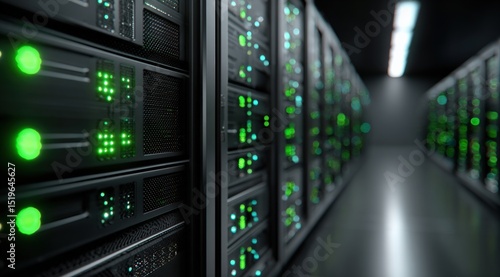 Close up view of server racks in a data center with green lights indicating activity and connectivity