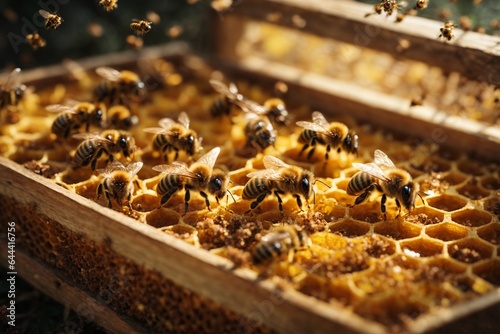 Close up view of the working bees on honey cells. Beekeeping concept.
