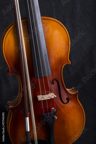 Close up Violin Scroll and bow standing on black background