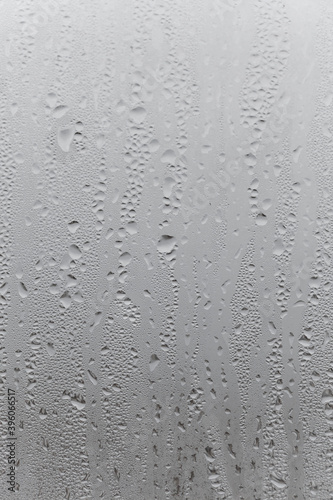 Close up water drop on grey background, misted glass with droplets of water draining down. Dripping Condensation